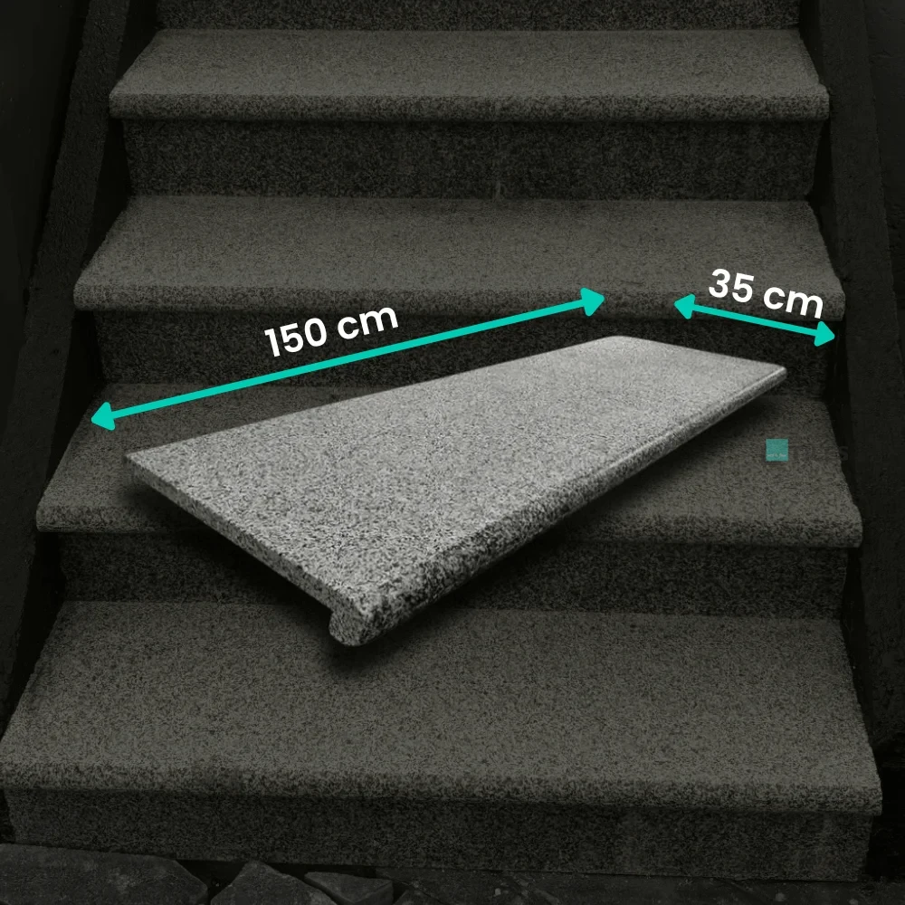 Gotowa stopnica granitowa o wymiarach 150x33x3 cm, przeznaczona do montażu na schody zewnętrzne. Płomieniowana powierzchnia zwiększa antypoślizgowość, a wykończona krawędź nadaje estetyczny, nowoczesny wygląd. Trwały granit sprawdza się w każdych warunkach atmosferycznych.
