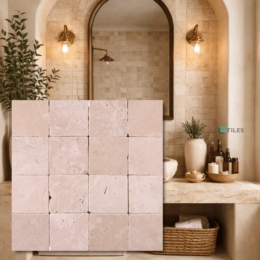 Trawertyn Light w jasnej, ciepłej beżowo-kremowej kolorystyce to naturalna płytka kamienna o eleganckim i ponadczasowym charakterze. Bębnowane wykończenie nadaje jej delikatnie postarzoną formę.