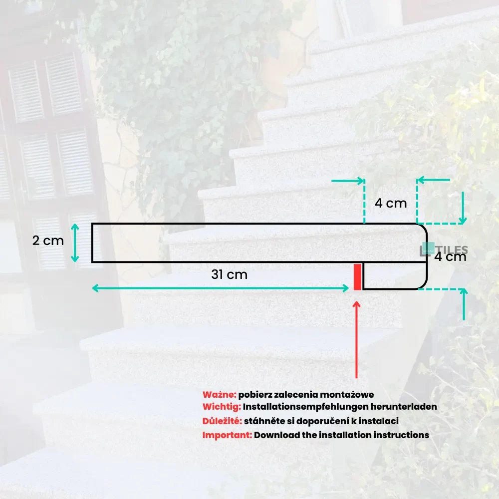 Płomieniowana powierzchnia stopnicy zapewnia odpowiednią przyczepność, minimalizując ryzyko poślizgnięcia. Polerowana podstopnica podkreśla estetykę zestawu i ułatwia jego czyszczenie. Do pielęgnacji zaleca się stosowanie specjalistycznych środków do kamienia naturalnego.